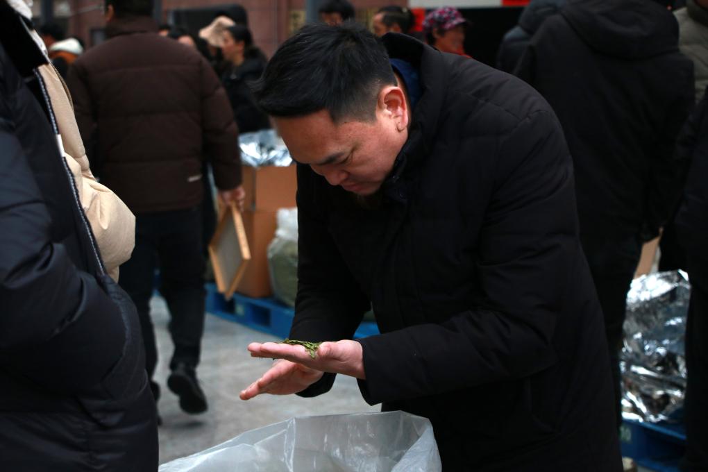 2月5日,贵州省普安县中国早茶交易中心内,一位茶商在选购干茶。新华社记者郑明鸿 摄