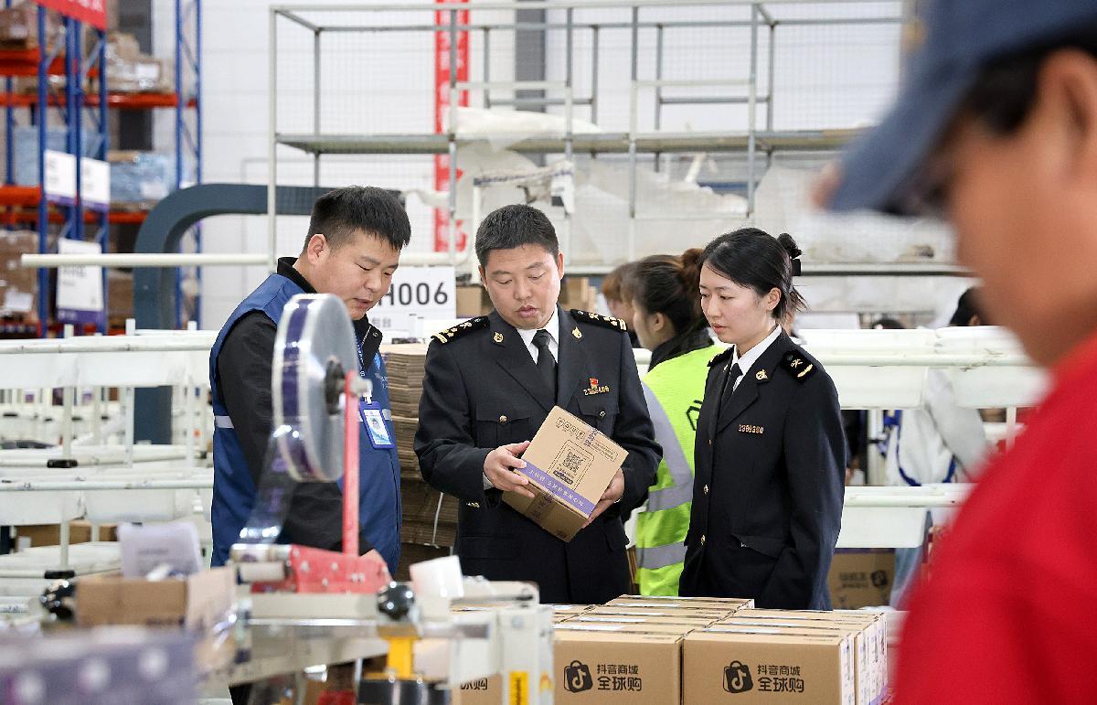 图为11月10日,南通海关关员在南通综合保税区某公司跨境仓库,现场查看打包发运的包裹。