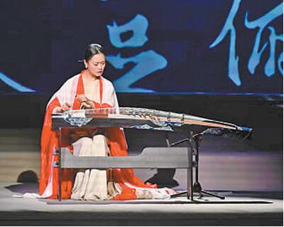 在《墨戏》中,古筝演奏配合中国舞的水袖身姿,刚柔并济,虚实相生,展现书法艺术行云流水的音韵美、律动美和线条美,让人沉浸在水墨世界中。多媒体画面选自《兰亭集序》,琴音流转,笔墨挥洒。