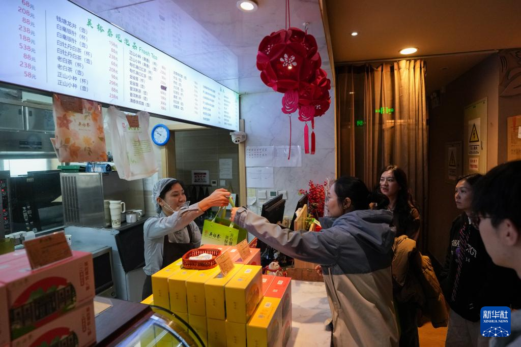在位于北京前门大街的吴裕泰茶庄,工作人员(左一)将茶饼干递到顾客手中(11月15日摄)。新华社记者 鞠焕宗 摄