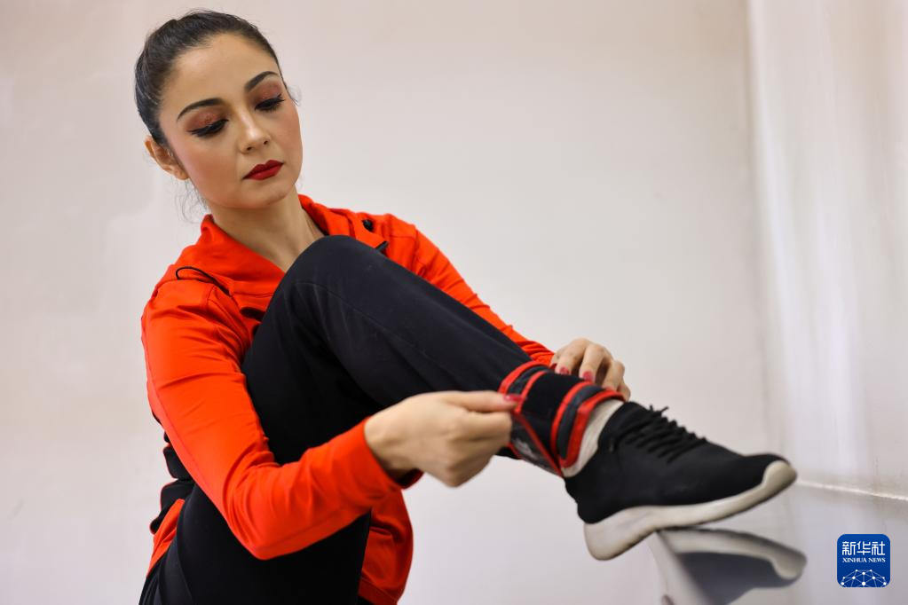 在新疆艺术剧院木卡姆艺术团剧场,演出前马依热·艾买提江“拉筋”热身(4月22日摄)。
