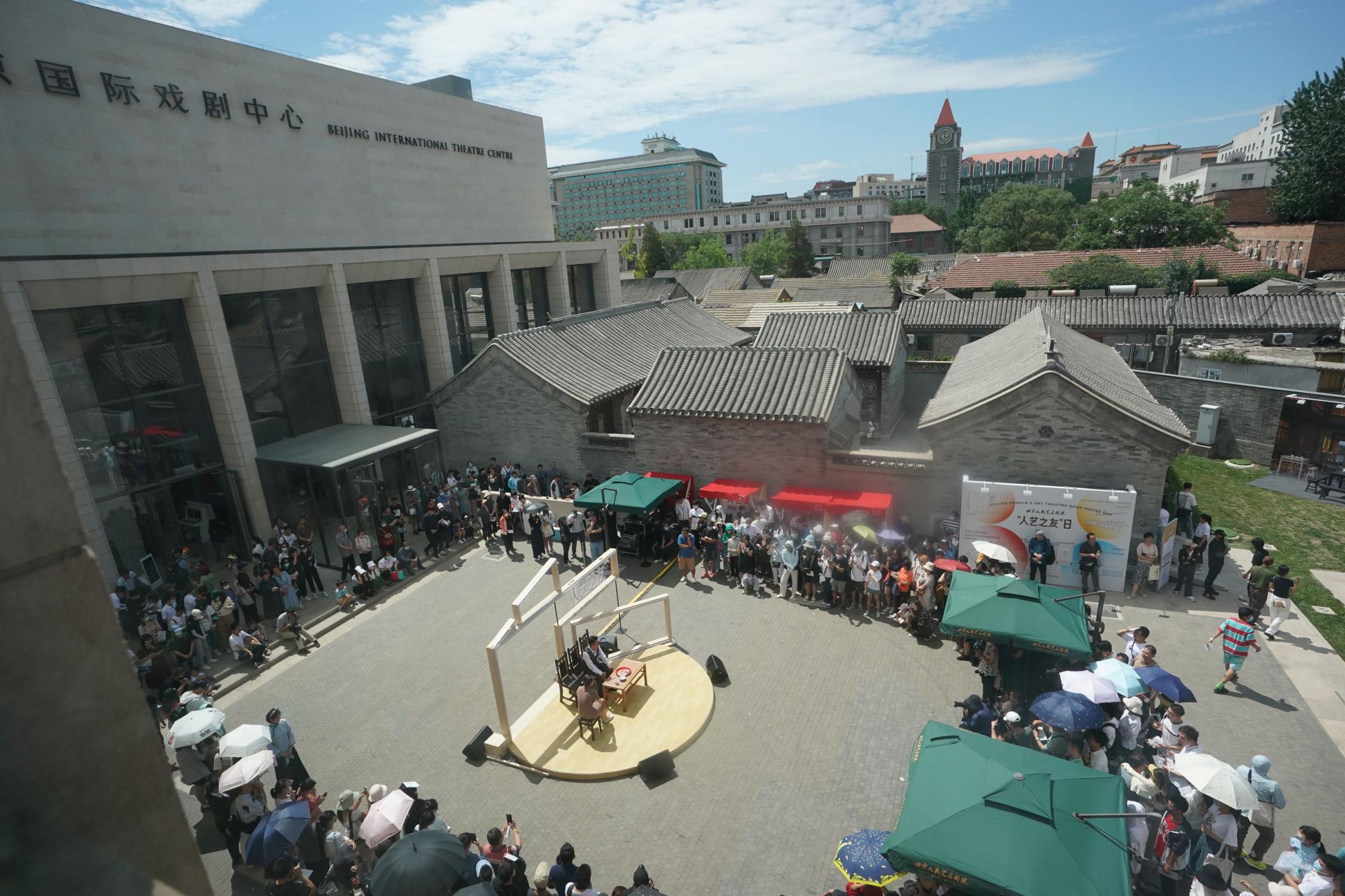 在这两天里,戏剧总会与观众不期而遇:北京国际戏剧中心前的广场上,热闹的戏剧市集人流如织,文创、书籍、美食不一而足;广场主舞台上,北京人艺青年演员和来自学校、社区的“人艺之友”们轮番带来《丁西林民国喜剧三则》《咸亨酒店》《原野》等经典作品片段快闪;濮存昕、冯远征、何冰、杨佳音分别在不同的剧场空间为观众分享剧目创作的点滴故事;一起碰“词”儿游戏邀请观众在台词中回忆剧目名称,集章打卡;“戏剧课堂”不仅有“声声入耳”舞台音效及现场拟声互动讲座,让观众秒变“拟音大咖”,还有“以假乱真”舞台道具制作体验,由北京人艺舞美工作人员带领观众现场制作特色道具,让观众了解幕后的创作过程;北京人艺戏剧博物馆院史特别导赏环节由2022级北京人艺表演学员培训班的学员担任志愿讲解员,为观众们生动讲解人艺历史,重拾71年珍贵回忆……