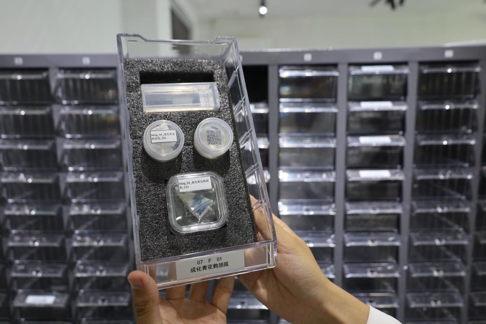 景德镇御窑博物院工作人员展示一份明成化时期的古陶瓷基因标本。(王凯丰摄)